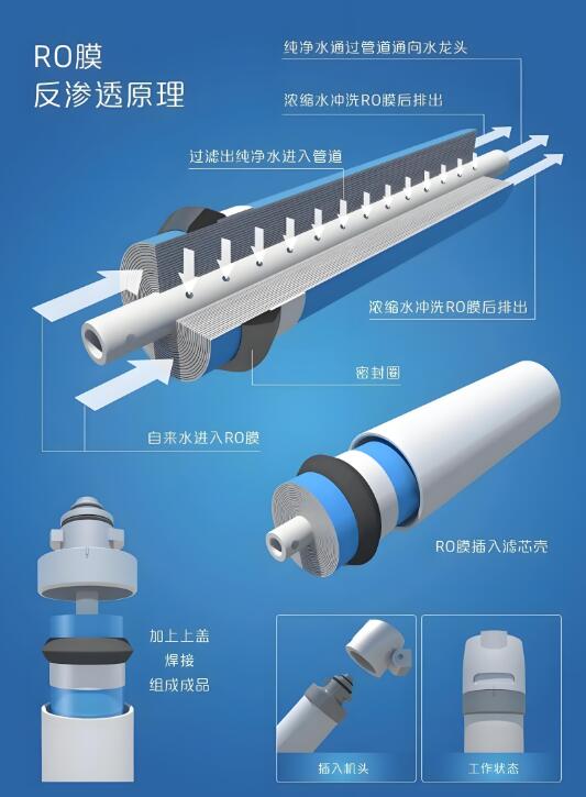 反渗透:顾名思义,就是施加一个大于自然渗透压的外力(通常是泵的压力),迫使高浓度溶液中的溶剂(水分子)反向穿过半透膜,流向低浓度的一侧。这样一来,高浓度溶液中的水分子被“挤”出来,而溶解在水中的盐分、细菌、病毒等杂质则被半透膜截留,从而实现纯水与杂质的分离。