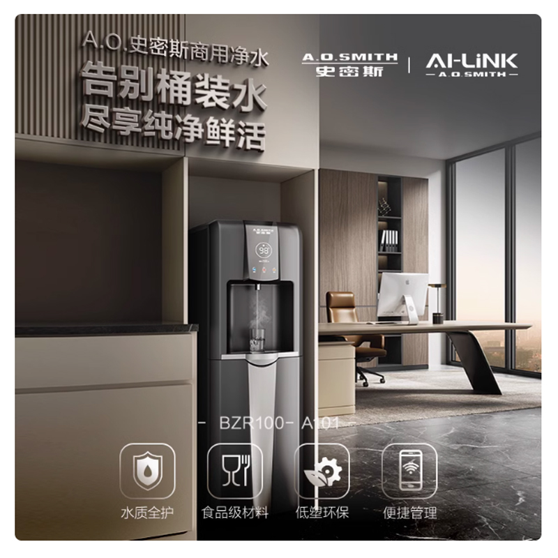 A.O.史密斯 BZR100-A2117商用反渗透净水器,采用高效过滤技术,有效滤除细菌重金属,同时具备加热功能与除水垢技术,满足办公、学校等公共场所的直饮需求