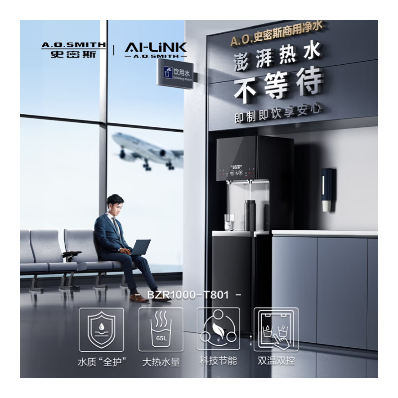A.O.史密斯BZR1000-T801商用净水器,A.O.史密斯商用直饮水机公共空间饮水解决方案,适合大型工厂、学校、医院、营业厅、车站、机场等公共空间直饮水场所。