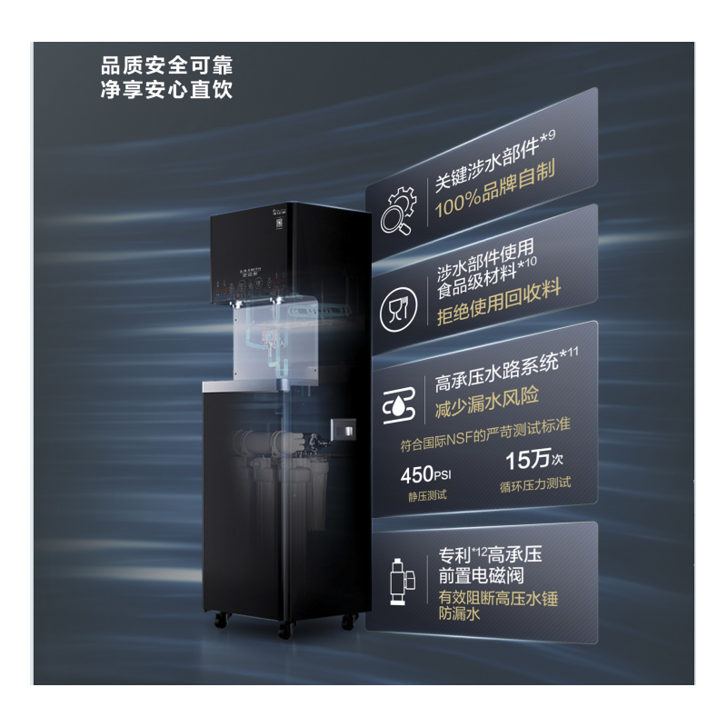 直饮水水质标准:A.O.史密斯商用净水器 直饮水机出水水质符合《生活饮用水水质处理器卫生安全与功能评价规范-反渗透处理装置》(2001)的要求。